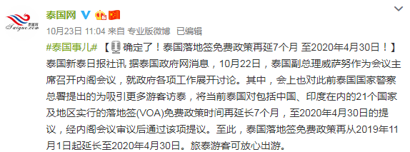 泰國內(nèi)閣會議通過延長赴泰落地簽免費措施,